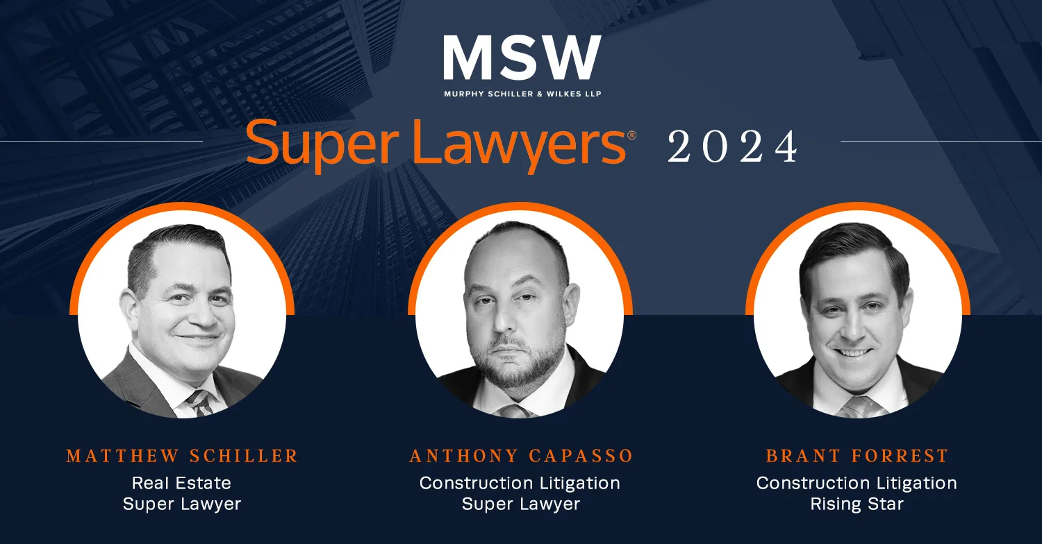 Murphy Schiller & Wilkes LLP (MSW) is a boutique law firm servicing the commercial real estate and construction industries. Headquartered in Newark, New Jersey, the firm represents a wide range of clients, including institutional, publicly traded real estate companies, international and regional lenders, national contractors and subcontractors, and family offices. The firm has been ranked as a top law firm by both Chambers & Partners and U.S. News & World Report.