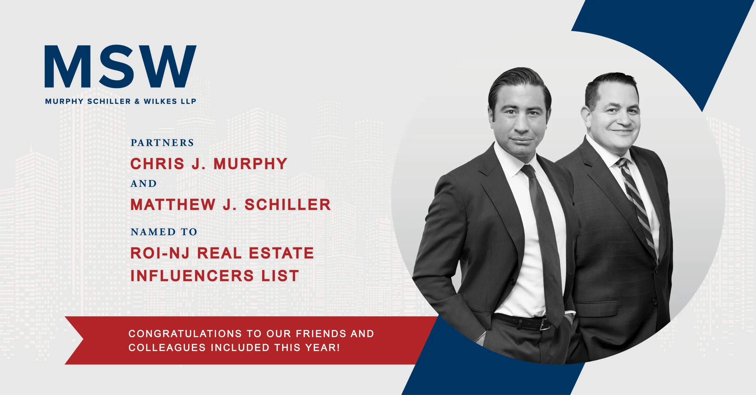 Murphy Schiller & Wilkes LLP (MSW) is pleased to announce that Chris Murphy and Matthew Schiller have been named to ROI-NJ’s 2020 Influencers - Real Estate List. The list contains influential “power players” helping to shape New Jersey’s real estate industry. In recognizing the firm, ROI-NJ stated the following: