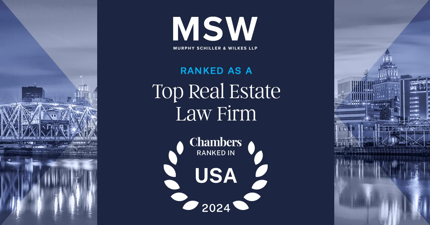 Murphy Schiller & Wilkes LLP (MSW) is proud to announce that the firm has been selected as a top real estate law firm in the Chambers USA 2024 rankings. Chambers USA ranks the top 3% of lawyers and law firms across the United States.