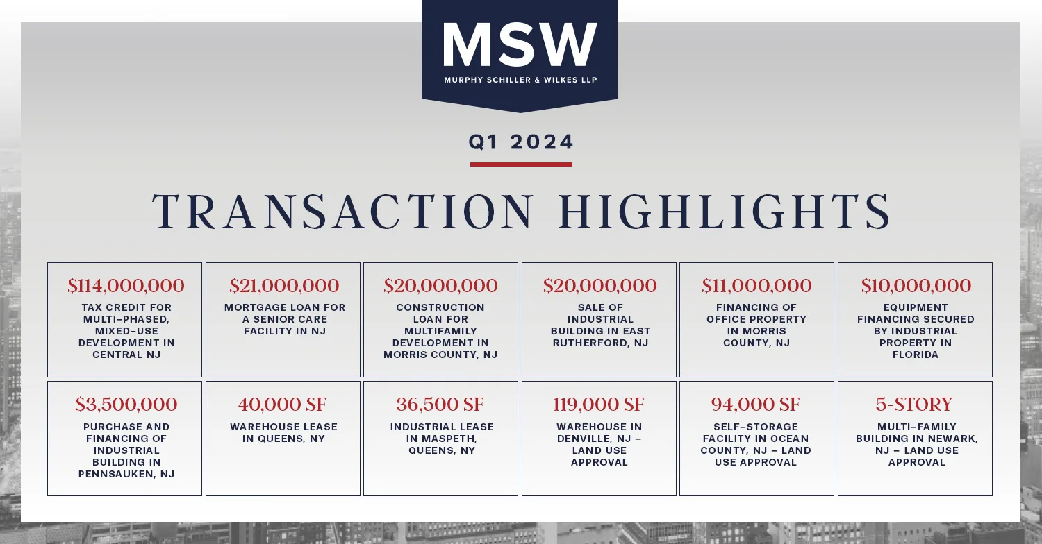 The first quarter of 2024 started off strong for the attorneys at Murphy Schiller & Wilkes LLP (MSW), helping our clients close significant deals, both locally and nationally, secure noteworthy land use approvals, and obtain tax credits for transformational development projects.