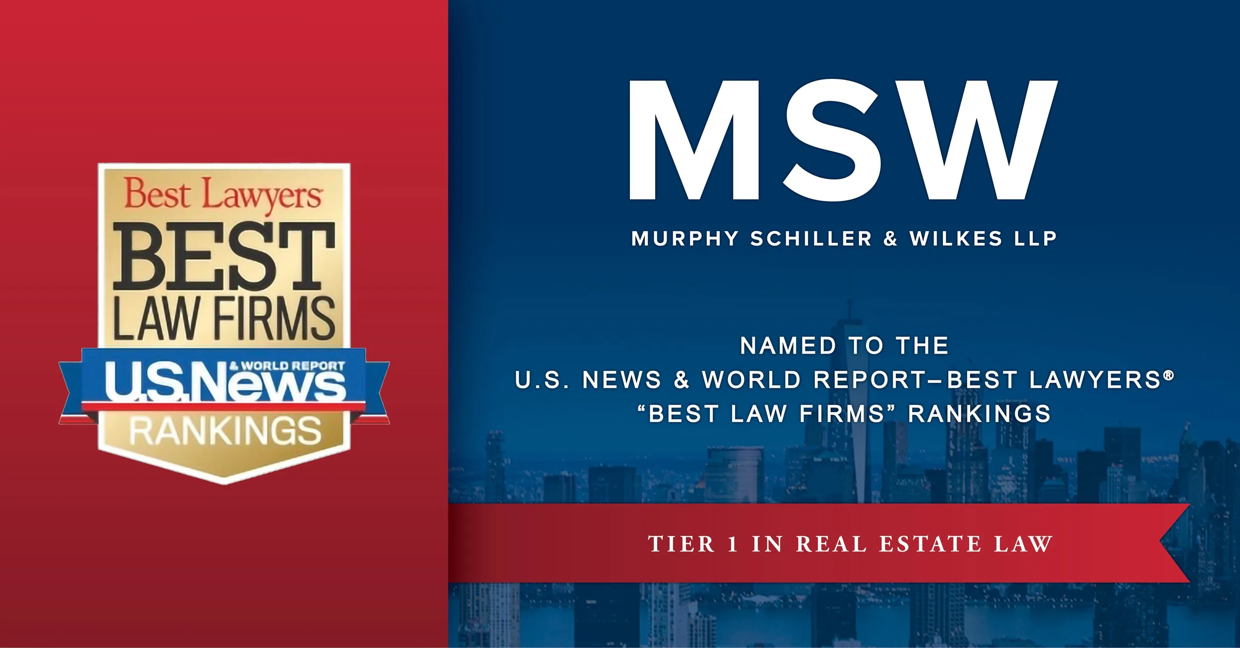 Murphy Schiller & Wilkes LLP (MSW) is proud to announce that the firm has been recognized by U.S. News & World Report—Best Lawyers® “Best Law Firms” as a Metro Tier 1 law firm in Real Estate Law.