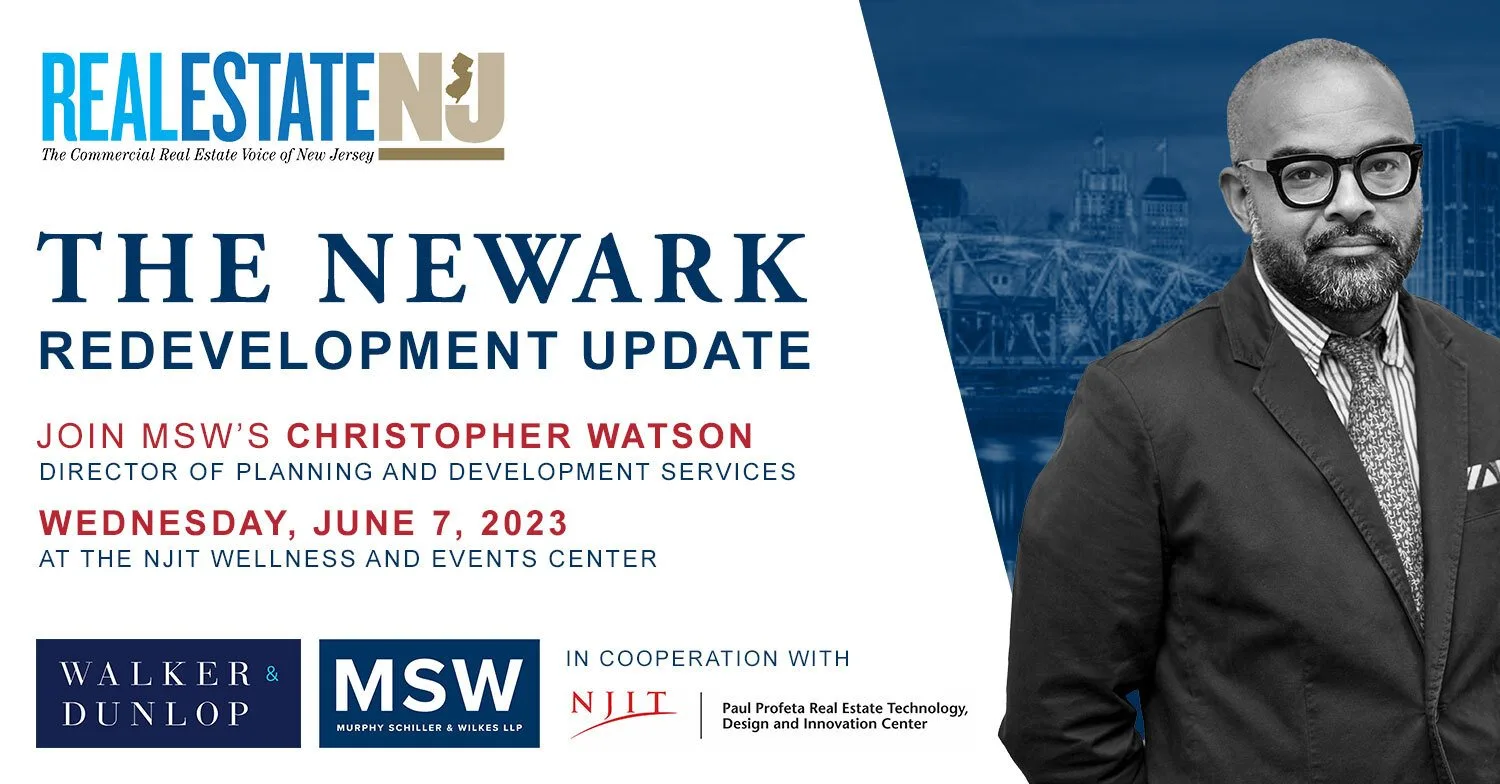 On June 7, 2023, MSW Director of Planning and Development Services, Christopher Watson will be a panelist at The Newark Redevelopment Update presented by Real Estate NJ. The event is being sponsored by Walker & Dunlop and MSW in cooperation with NJIT – Paul Profeta Real Estate Technology, Design and Innovation Center. This event is being held at the NJIT Wellness and Events Center and will begin at 8:30am.