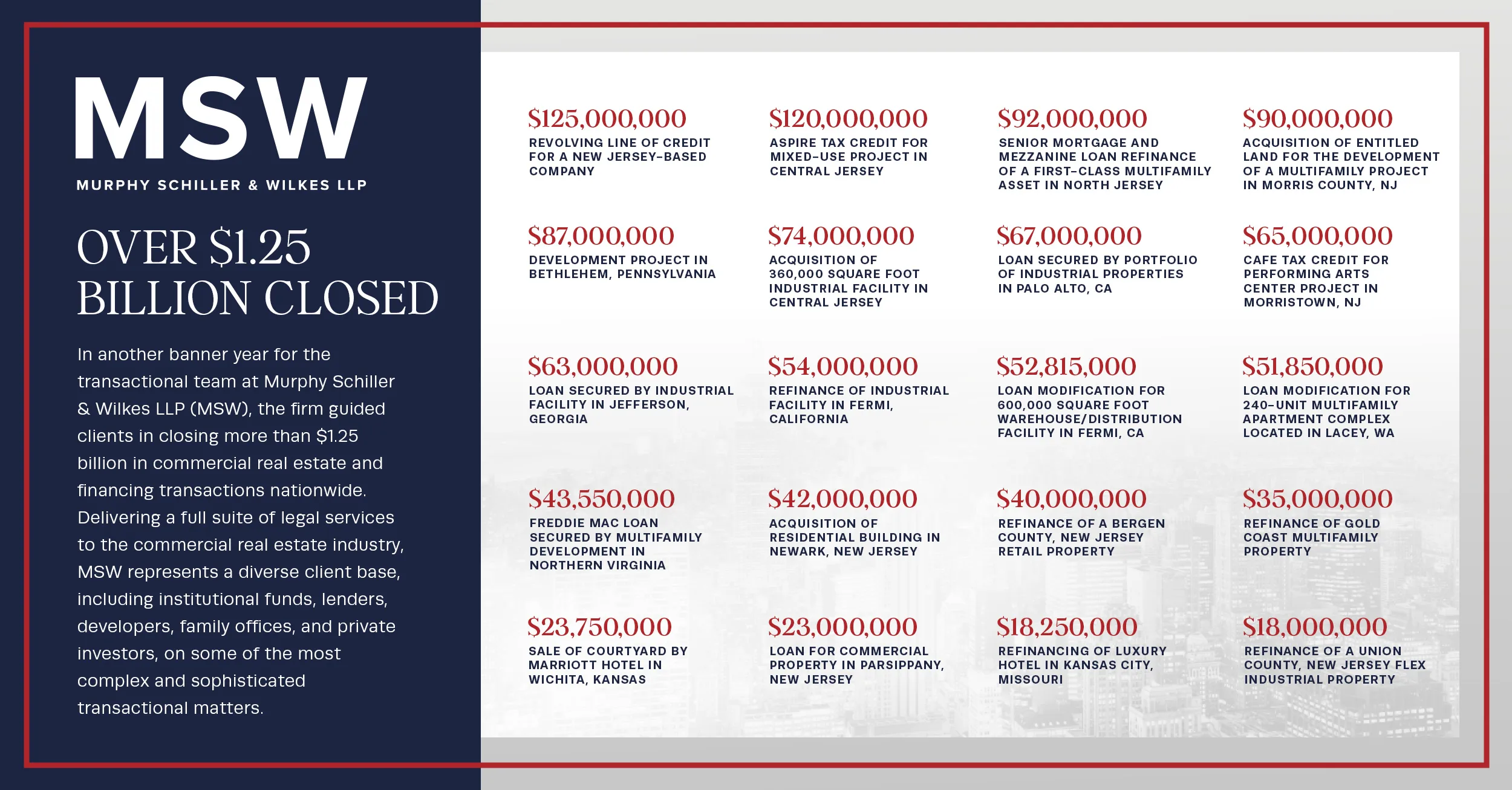 In another banner year for the transactional team at Murphy Schiller & Wilkes LLP (MSW), the firm guided clients in closing more than $1.25 billion in commercial real estate and financing transactions nationwide. Delivering a full suite of legal services to the commercial real estate industry, MSW represents a diverse client base, including institutional funds, lenders, developers, family offices, and private investors, on some of the most complex and sophisticated transactional matters.